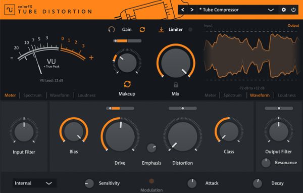 All colorFX include professional visualization aids for input and output such as VU meter or as a waveform display.