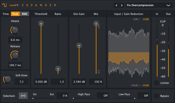 coreFX Expander The coreFX Expander works as a companion to a compressor and lets you achieve exceptional accentuated sound. Louder impulses can be further amplified and quiet ones made even quieter. The dynamic range of an audio signal is expanded and the envelope as well as the tonal character of the signal si changed.
