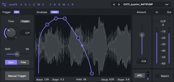 A pump effect without complicated sidechain routing that is created by rhyhmically reducing and increasing the volume. The shape of the envelope, i.e., decrease and increase, as well as the modulation frequency, e.g., to match the beat, can be freely adjusted. This creates a gate or sidechain effect, which is frequently found in house and EDM as well as in rock and pop.