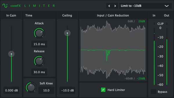 The quintessential mastering tool: The coreFX Limiter sets a maximum output level for an audio signal, which cannot be exceeded. Thanks to two variations of transparent clipping, it is possible to drastically reduce peaks and increase loudness without difficulty.