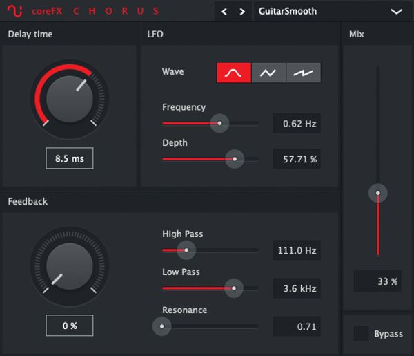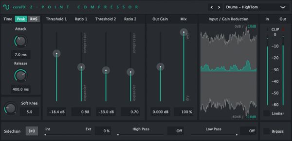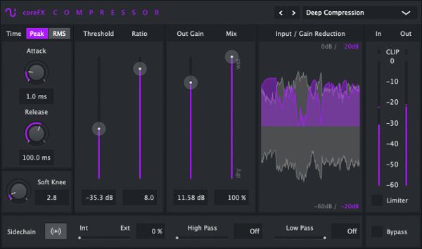The coreFX Compressor equalizes parts with different volume levels to create powerful mixes and smooth peaks. The sidechain filter and low-pass filter ensure the finer details. A number of compression options from subtle to heavy can be set without any problems.